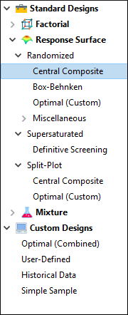 をクリックしてから、左側のデザインのリストから “Response Surface” をクリックして、RSMで使用可能な計画を表示します。