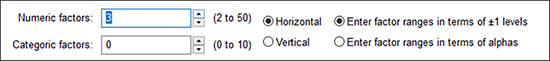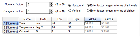 | ※ 別の方法による CCD の配置について: なお、“entered factor ranges in terms of alphas” オプションをクリックした場合は、指定した因子毎に試行間の距離をどれだけ離すかを制御することができます。 |
