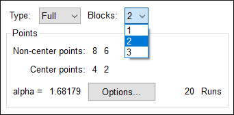 それでは中心複合計画のフォームの下に戻ってください。Type の値はデフォルトで指定された Full のままで結構です (もうひとつの選択肢は “Small” CCD です。試行数を最小限に減らす必要がない場合はこのオプションはお勧めできません) 。この計画では、試行日ごとに合計2ブロック必要となりますので、Blocks フィールドをクリックして “2” を選択してください。