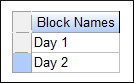 ソフトウェアの画面で、この CCD の2つのブロックがどう配置されるかに注目してください。例えば、片方には4つの中心点が、もう片方には2つの中心点が配置されることになります。“Next” をクリックして、応答曲面計画を構築する “Wizard” の2ページ目に移ってください。Block Names を識別するオプションがあらわれますので、以下のようにそれぞれ 「Day 1」、「Day 2」 と入力してください。