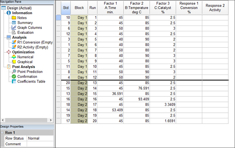 新たに追加された Type 列では、各点が “Factorial”、“Center”(中心点)などと識別されている点に注目してください。要因点が Day 1 のブロックのみに整列している点に注目してください。従って、軸点は Day 2 ブロックのみで試行されることになります。中心点は、両方のブロックに分かれています。