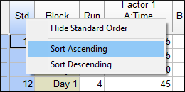 それでは、今開いたデータの分析にとりかかりましょう。左側の “Design” ノードをクリックして、デザインスプレッドシートを表示します。Std 列の一番上にマウスのカーソルを移動して、メニューを右クリックして表示させたら、そこから “Sort Ascending” を選択してください(ヘッダーをダブルクリックしても同じことができます)。