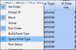 この Type 列は Select オプションのデフォルト設定を変更しないかぎり、Design-Expert を次回起動しても表示されることはありません。この段階で情報を確認するために一時的に表示させたかっただけです。