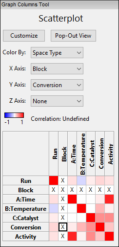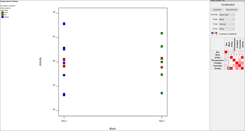 | ※ カラーコード付き相関グリッドについて グラフ2列と共に表示される相関グリッドは非常に興味深いものです。 先ずは対角線に沿った赤い表示をご覧ください ― これはどの変数もそれ自身 (例えば、Run vs Run 等) に対しては完全な (r=1) 相関があることを示しています。Block vs. Run(または逆に、Run vs. Block)も無作為化されたこの制約条件 (1日目、2日目の順に run (試行) が実行される必要があること) によって高い相関を示しています。 四角い空白が数多く存在していることも確認してください。これらは、因子間の相関が少ないか存在しないことを示しており、独立していると見なすことができます。 |