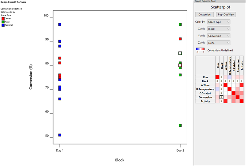 この時点でもっとも役立つのは、ブロックの影響をあらわすプロットの作成です。これは文字通り分析を見えなく(ブロックアウト)するからです。従って以下に示すように、 Graph Columns ツールで “Conversion” と “Block” を選択してください。また、Color By は “Space Type” に変更してください。