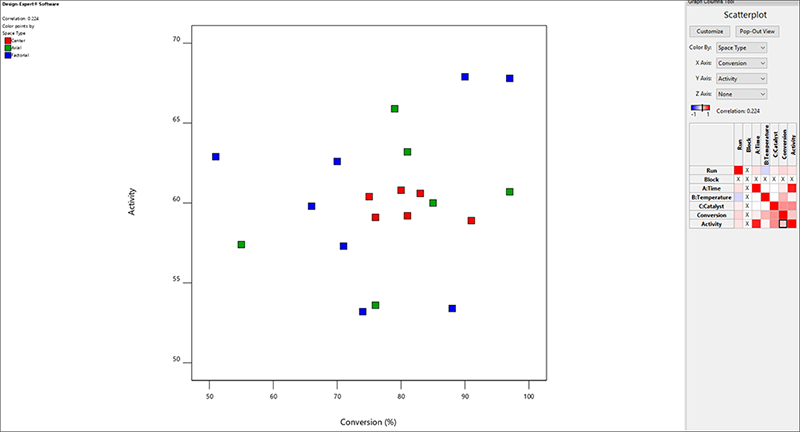 次に、応答がどのように相関するかを確認するには、X Axis を “Conversion” に変更します。軸に沿って2つの数値因子があるので、それらの間の相関関係を確認できます。凡例の左上には相関数が0.224とあり、わずかに相関していることを示しています。