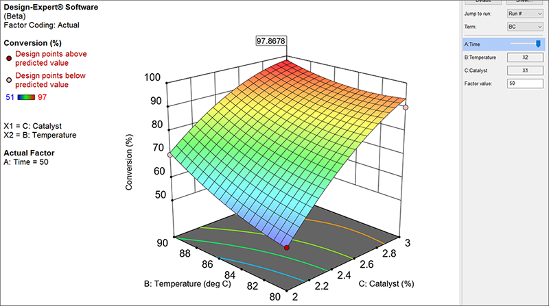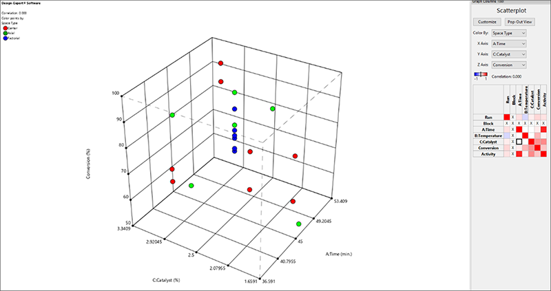 3Dでわかりやすい散布図を作成するには、X Axisを “A:Time” に、Y Axis を “C:Catalyst”に、Z Axis を “Conversion” に変更します。これにより、応答を最大化する条件のグラフが表示されます。これをマウスで掴んで回転させてみてください。これは非常に良好な結果に見えます!