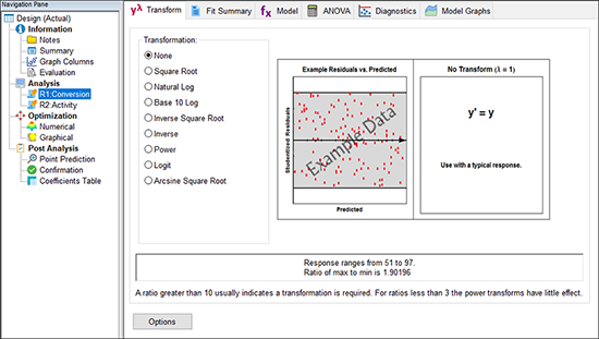 Design-Expert の Transform オプションには、応答値を変換するあらゆる関数が用意されています。それぞれの詳細については Tips をクリックしてください。この場合は、デフォルトで指定された変換を使うので、選択肢は “None” のままで結構です。