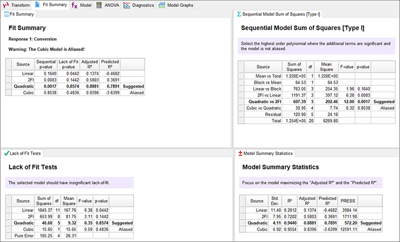 次に、“Fit Summary” タブをクリックしてください。ボタンをクリックした時点で、Design-Expert は応答値に対して linear(線形)、2FI(2因子交互作用)、quadratic(2次)、および、Cubic(3次)多項式を当てはめます。画面の一番上には応答を識別する内容が記載されていますが、この事例の場合、そのすぐ下に、次の警告が表示されています:“The Cubic Model and higher are Aliased.”(3次モデル以上はエイリアス化されます)。これを見ても心配しないでください。中心複合行列で提供される固有の計画点が3次モデルですべての項を決定するには少なすぎるというのは、予め想定されたことです。セットアップできるのは2次モデル(またはそれより低次のモデル)のみです。