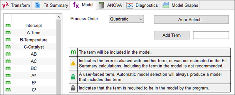 Design-Expert では、より踏み込んだ統計学的研究の目的でモデルを選ぶことができます。画面の一番上にある “Model” ボタンをクリックして、このモデルに含まれる項を確認してください。
