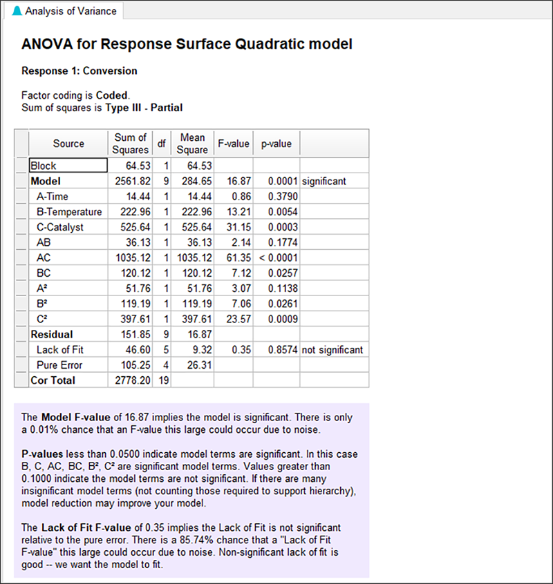 この事例の ANOVA 表では、2次モデルが妥当であることを確認できます(Model の Prob>F 値が 0.05 より下回っています)。モデル内の項の確率値を個別に調べることも可能です。確率値が 0.10 より大きい項を除外したい場合があるかもしれません。その場合は処理に関する知識を使用すれば判断基準を変更できます。