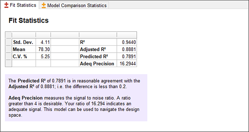 次に、“Fit Statistics” ペインに移動して、Design-ExpertがANOVAを拡張するためのさまざまな統計を表示することを確認します。 R-Squared統計は非常に優れており、1に近い値をとっています。