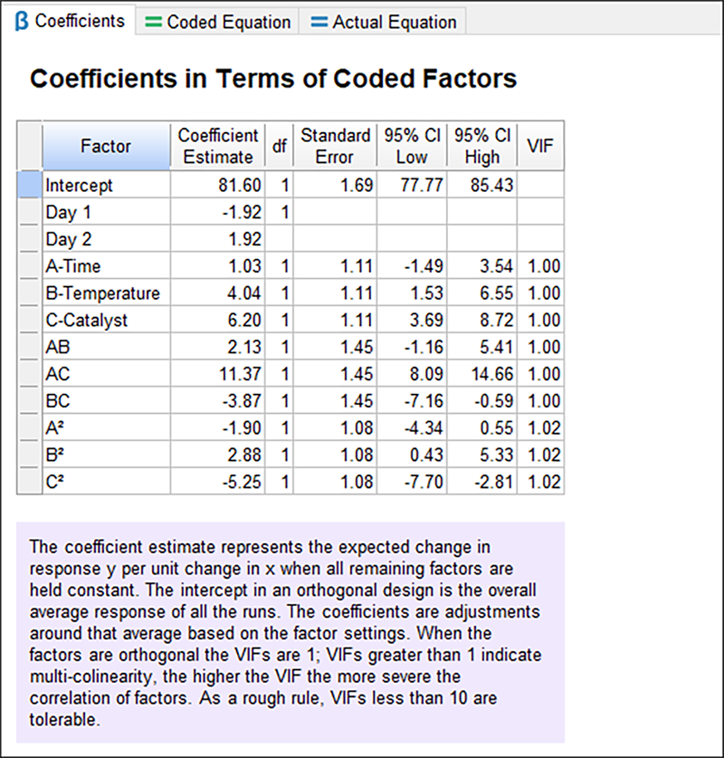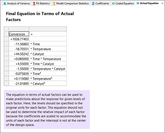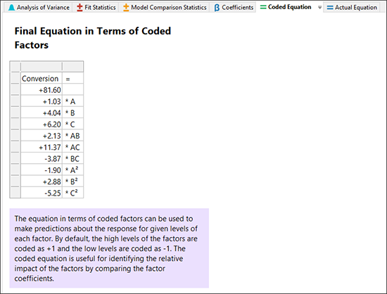“Coded Equation” を押して、次のセクションを画面に表示します。実際の要因に関する予測モデルについては、“Actual Equation” をクリックしてください。ブロック項は省略されています。これらの項は、この実験の結果を再現するためには使用できますが、将来の応答をモデル化するためには使用できません。