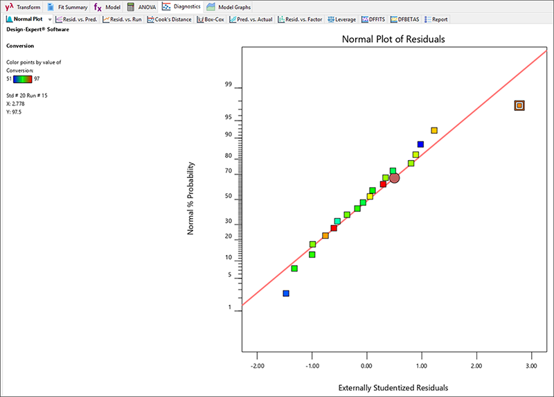 Design-Expert の診断の詳細は、プロットを表示させることによって最もよく理解することができます。“Diagnostics” タブを押してこれを表示させてみましょう。一番重要な診断内容、すなわち残差の正規確率プロットが最初のペインに表示されます。