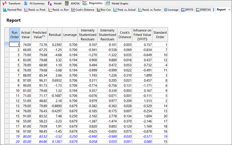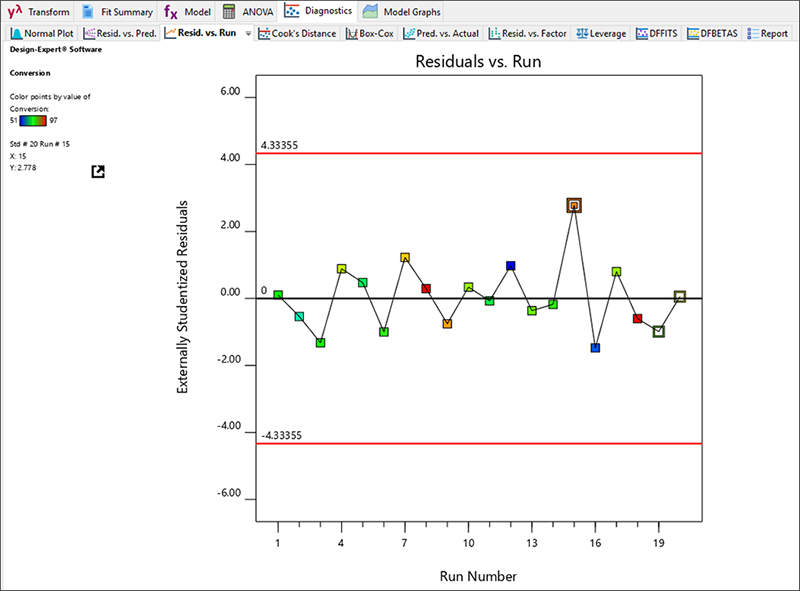 | ※ Design-Expert で残差を表示するには 画面上部のドロップダウンメニューで形式を変更しない限り(推奨はしません)、残差は外部スチューデント化されることに注意してください。 ・残差を外部的に計算すると外れ値の検索感度が増加します。 ・スチューデント化残差は、計画のポイントの位置の違いによるレバレッジ間の影響を低くします。例えば、中心点は、当てはめに関して影響力はほとんどありませんので、レバレッジはそれだけ低くなります。 |