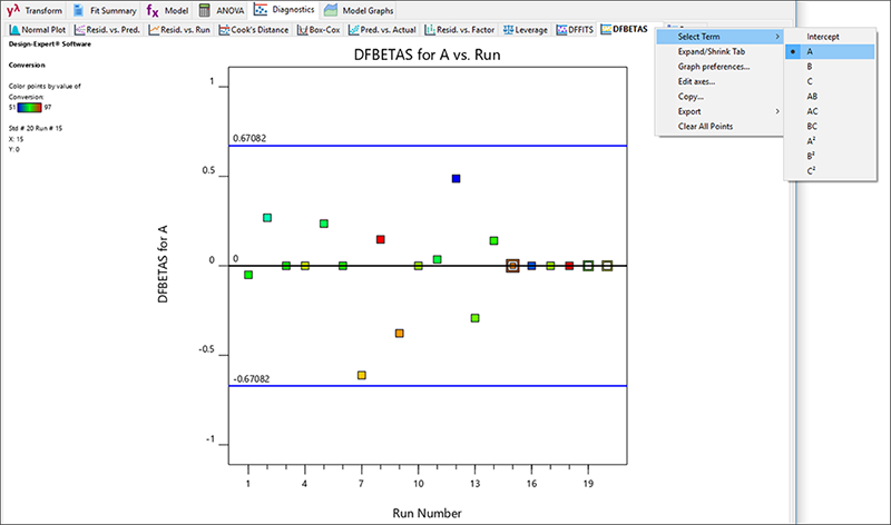 “Leverage” タブに移動します。Leverage については、「一元配置実験」チュートリアルで詳しく説明しています。まだ読んでいないのであれば、戻って参照してください。次は “DFBETAS” を指定します。このボタンを使用すると、各係数に対するモデル内の変更を分析し、統計の専門家はギリシャ文字の β で表すことができます。こうした理由から the difference in beta(ベータでの差異)の頭文字を採用して DFBETAS となりました。下向き三角矢印をクリックして、以下のスクリーンショットのように Term に “A” を選択します。