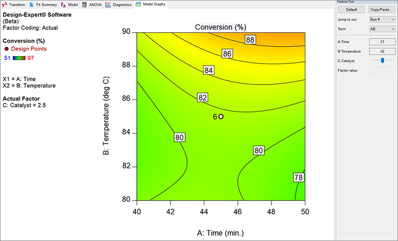 | ※ 多因子空間で計画の点 (ポイント) を視覚化するには Design-Expert では、設計空間に含まれるすべての実測点 が表示される点に注意してください。ここに表示されているプロットは、時間と温度の関数として表された反応率が触媒 (因子 C) の中間水準でスライスされたものです。この断面には、等高線プロット中央の赤い点に示されているように、中心点が6つあります。中心点の繰り返しによって、実験領域の中間地点の予測力が非常に高くなります。 |