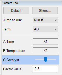 それでは、 Factors Tool にある Default ボタンをクリックして、因子 C の位置を中央の水準に戻します。