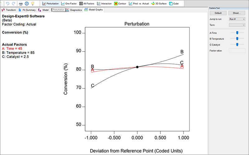 応答曲面計画の場合、摂動プロットは、ある因子を指定した参照点から移動させることによって応答がどのように変化するかを示します。このとき他のすべての因子の値は参照値で固定されています。Design-Expert で指定される参照点は、通常、設計空間の中央がデフォルトとなります(コード化された各因子水準のゼロの地点)。