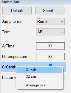 それでは、因子 B と C からなるプロットを見てみましょう。まず、Graphs Toolbar から “Contour” をクリックして開始します。Factors Tool にある “Catalyst” バーを右クリックして、“X1 axis” を選択します。