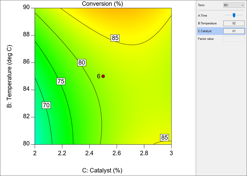 因子 A の曲線をクリックすると、見やすくなります。選択した曲線は上の図に示すように異なる色で強調表示されます。このとき、凡例も一緒に協調表示されます。この場合、中心点で因子 A(Time)を参照点から移動させることによって、それが生み出す効果は比較的小さいことを確認できます。従って、等高線には一度に2つの因子しかプロットすることはできないので、ここでは、因子 B と C を選ぶのが良いことになります。因子 A はスライスに使います。