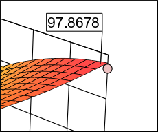画面左側のカラーキーが示すように、曲面の応答水準が高いところほど「hot (熱く)」なっており、80%台では黄色に、90%以上では赤となっています。