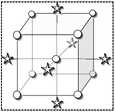 | ※ CCD の構成について この CCD の3因子の配置を図で表すと以下のようになります。核となる要因が立方体の頂点として構成されており、コード化した2つの構成単位(上記テーブルに記載した -1 から 1 )が向かい合う面の距離となります 。星印は軸点をあらわします。立方体からこの軸点をどれだけ遠ざけるべきかは、統計学者間で大いに議論される問題ですが、コード化された因子水準を尺度とするこの距離は「α(アルファ)」と呼ばれます。これから順次見て行きますが、Design-Expert には α に関する様々なオプションが用意されています。 ![]() 3因子の中心複合計画 |