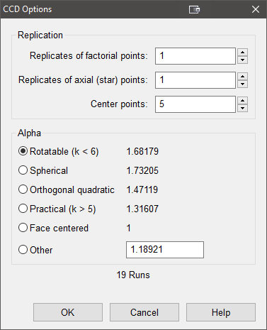 | ※ その他の RSM 計画の選択について 因子と範囲を入力する前に、 “Options” をクリックしてみてください。そこでは、デフォルトで Rotatable 計画が指定されており、中心からの軸(星)点の距離がコード化された単位で 1.68179 と設定されている点に注意してください。これは CCD における標準的な選択となります。 ![]() CCDで回転可能な計画を指定するデフォルトのα設定オプション α に関するオプションの多くは統計的に導き出されるものですが、因子範囲の最大値よりも小さい値を生成する“現実的”なオプションもあります。これは因子数の4乗根をとることによって計算されます (この事例では、3 の4乗根すなわち 1.31607 となります) 。CCD の α で推奨されるこの現実的オプションと他の水準の詳細に関しては、RSM Simplified の第8章 “Everything You Should Know About CCDs (but dare not ask!)” をご覧ください。このうち、もっとも一般的なものは “Face Centered” (α = 1) となるでしょう。ここでは、OK をクリックして、Rotatable の値を適用します(以下のように、計画内で2ブロックに変更するまで “center points in each axial block” オプションは表示されません)。 |