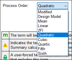 この事例では、2次の予測モデルに関して10個のモデル項 (intercept を含む) を評価できます (以下の補足を参照)。