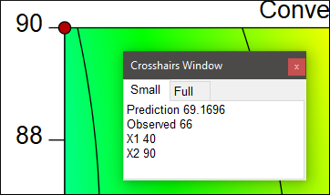 | ※ Crosshairs ツールを使用してグラフの座標を検討する ここで、等高線プロットの座標を調べるのに便利なツールを有効にしてみましょう。“View” メニューの “Show Crosshairs Window” を選択してください(画面の左側からタイトルバーの固定を解除する場合は、タイトルバーをクリックしてドラッグします)。それでは、等高線プロット上でマウスを動かしてみましょう。Design-Expert は、その地点に対応する因子の特定の値の予測応答値を生成することに注意してください。例えば、実測点(現在グラフの画面左上の隅にあるものです)上に十字カーソルを動かすと、その実測値も一緒に表示されます(この場合は 66 です)。 ![]() 実際に実験が行われた地点の座標 (40,90) における予測値 P.S. Crosshairs ツールで、Full オプションを押した場合の動作を確認してみてください。 |