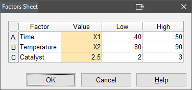 このチュートリアルの1ページに掲載したテーブルの情報(または以下のスクリーンショット)を参照して、因子(A、B、C)の Name 、Units 、Low 、High を入力しましょう。