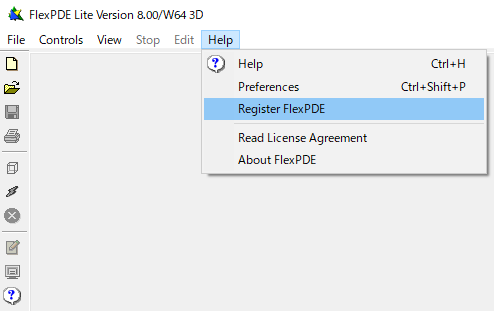 - メニューの ” Help -> Register FlexPDE ” を選択します。