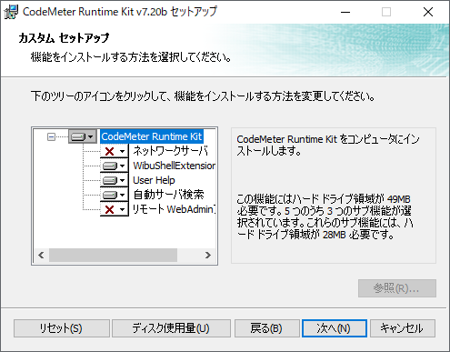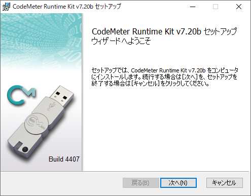 - 「CodeMeter Runtime Kit v7.20b セットアップウィザードへようこそ」画面が表示されます。「次へ」をクリックします。