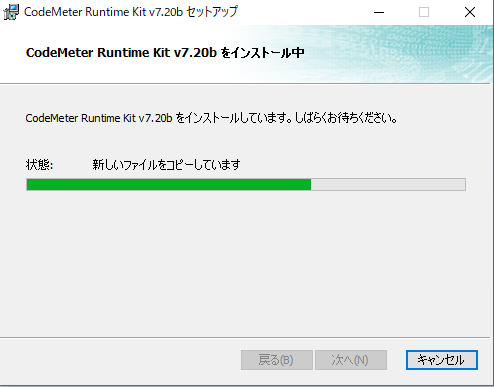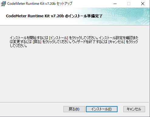 - 「CodeMeter Runtime Kit v7.20b のインストール準備完了」画面が表示されます。