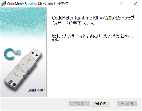 - 「CodeMeter Runtime Kit v7.20b セットアップウィザードが完了しました」画面が表示されます。