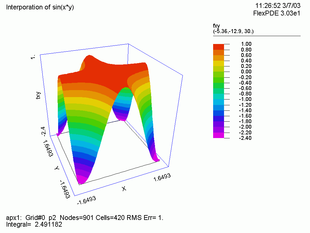 | TITLE ‘Interporation of sin(x*y) ‘ DEFINITIONS Lx=pi/2 Ly=pi/2 f=sin(x*y) fx=dx(f) fx_ex=cos(x*y)*y fxy=dx(dy(f)) fxy_ex=sin(x*y)*x*y+cos(x*y) BOUNDARIES region ‘domain‘ start(-Lx,-Ly) line to (Lx,-Ly) to (Lx, Ly) to (-Lx,Ly) to finish PLOTS contour(f) surface(f) surface(fx) contour(fx-fx_ex) surface(fxy) contour(fxy-fxy_ex) END |