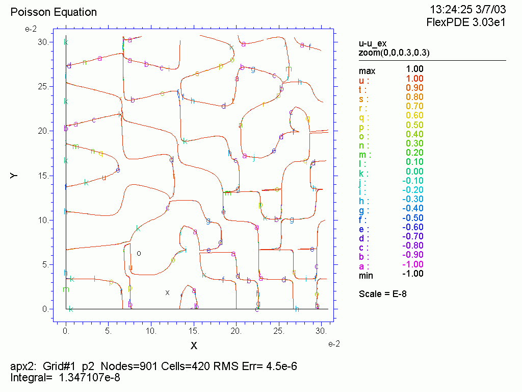 | TITLE ‘Poisson Equation ‘ SELECT errlim=1e-15 nodelimit=10 VARIABLES u DEFINITIONS Lx=1 Ly=1 u_ex=y^2*sin(x) EQUATIONS del2(u)=-(y^2-2)*sin(x) BOUNDARIES region ‘domain‘ start ‘outer‘ (0,0) value(u)=u_ex line to (Lx,0) to (Lx,Ly) to (0,Ly) to finish PLOTS grid(x,y) zoom(0,0,0.3,0.3) contour(u-u_ex) zoom(0,0,0.3,0.3) fixed range(-1e-8,1e-8) END |