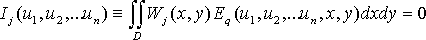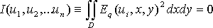 ここで、fk は x と y の関数です。 u(x,y) が PDE の厳密解であれば、Eq は解領域 D 全面にわたってゼロとなります。この領域について積分すると、