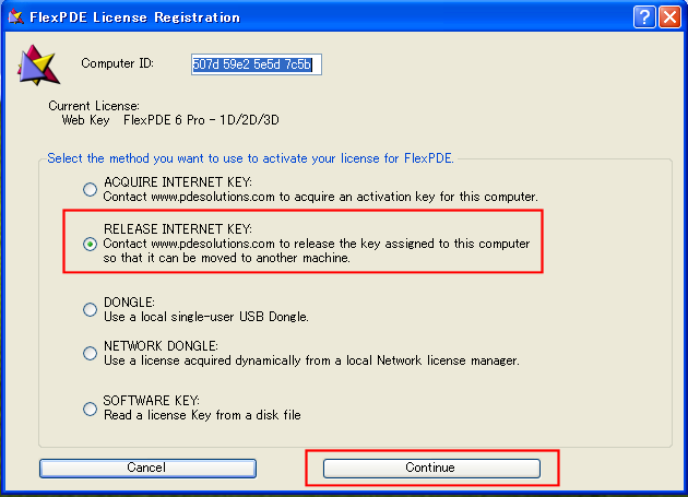 ”RELEASE INTERNET KEY:” を選択し、[Continue] ボタンを押す。