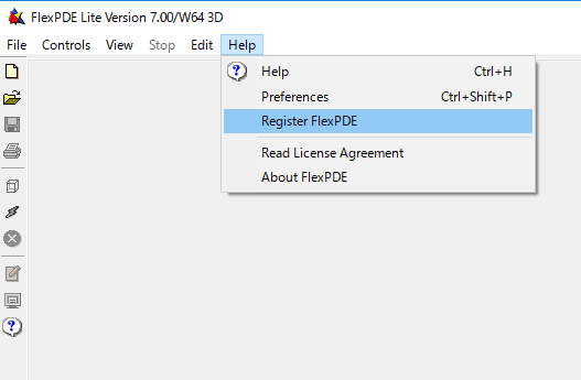 メニューの ” Help -> Register FlexPDE ” を選びます。