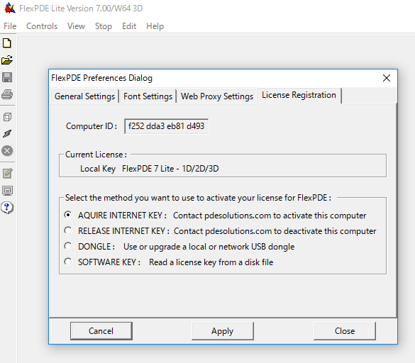 - [FlexPDE License Registration] ダイアログが現れるので、 ” ACQUIRE INTERNETKEY:” を選択し、[Apply] ボタンを押す。
