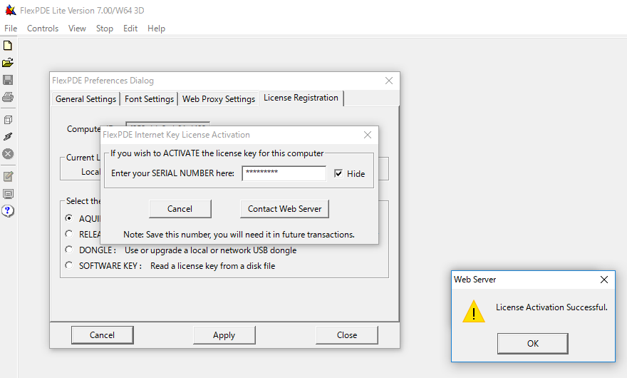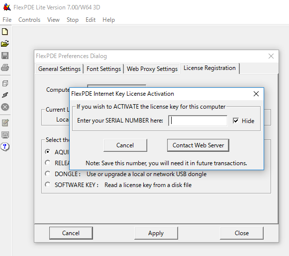 - [FlexPDE Internet Key License Activation] の画面で、Serial Number を入力します