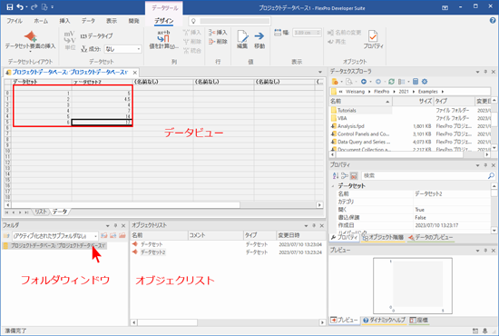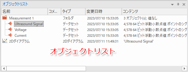 FlexPro では、ユーザー自身で作成するデータセットやダイアグラム、フォルダといった各種オブジェクトはいずれも FlexPro の「フォルダ」ウィンドウに表示される単一のプロジェクトデータベースに保存されます。以下に示す FlexPro ウィンドウの「オブジェクトリスト」には、既にサンプルとして幾つかのオブジェクトが表示されていますが、これらのサンプルオブジェクトは、FlexPro を起動した時点ではまだ表示されていません。