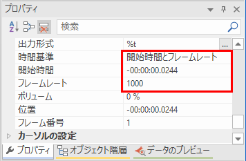 「プロパティ」ウィンドウの画面右側を下にスクロールして、「時間基準」フィールドを表示します。「開始時間とフレームレート 」を選択します。