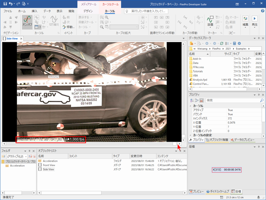 水平方向のスクロールバーのスライダーを右端に移動して、この動画の最後のフレームを表示します。動画のフレーム内に Frame: 376 というフレーム番号が、時間 350.60 ms が割り当てられています。FlexPro の「座標」ウィンドウを見ると、x[375]: 00:00:00,3506 と表示されるのを確認できます。(※訳注:表示される動画の最後のフレームは、FlexPro では Frame:374 までしか表示されませんが、「プロパティ」の「Xインデックス」で少し前 (例:373) に戻すと、フレーム内の時間と座標の時間が一致するのを確認できます。)