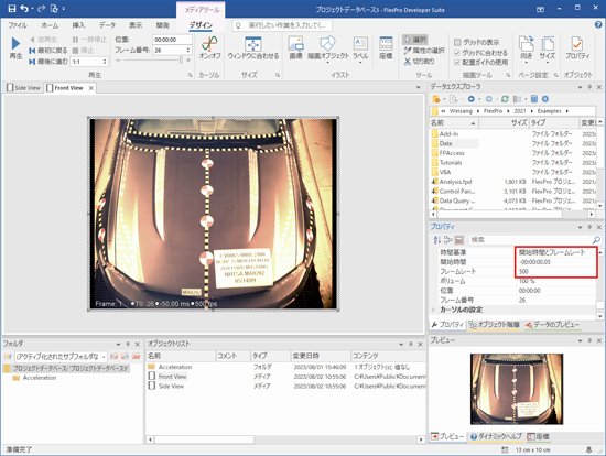 2番目の Front View という名称の動画は、フレームレート 500 fps で録画されたものです。先頭フレームに割り当てられた時間は -50 ms です。ここで、上記で説明した手順を練習として繰り返してみましょう。「オブジェクトリスト」で Front View という名称のメディアファイルを選択したあと、「プロパティ」ウィンドウの「時間基準」を「開始時間とフレームレート 」に変更し、「フレームレート 」(500 ) と「開始時間 」(-00:00:00.05 ) の値を変更してください。