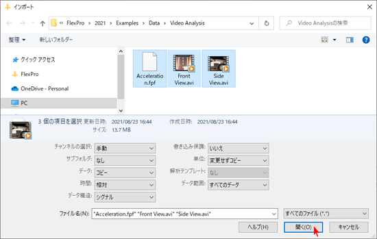次のパスを指定するか、日本語のフォルダ名で C: > ユーザー > パブリック > パブリックのドキュメント > Weisang > FlexPro > 2021 に移動します。そこから更に、Examples\Data\Video Anaylsis フォルダへ移動し、 2つの動画ファイルSide View.avi と Front View.avi 、および、計測データファイル Acceleration.fpf を選択します。