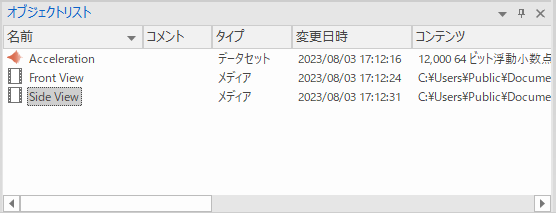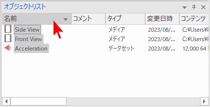 「オブジェクトリスト」の「名前」列を逆順にソートして、Side View , Front View , Acceleration を選択状態にします。