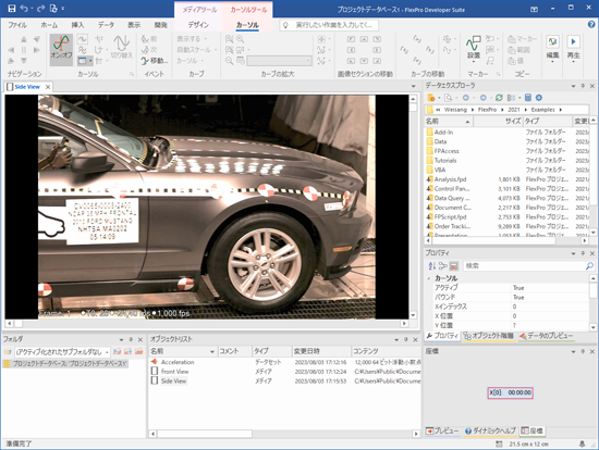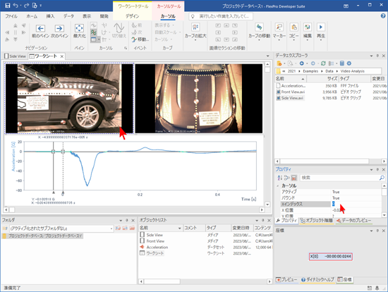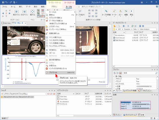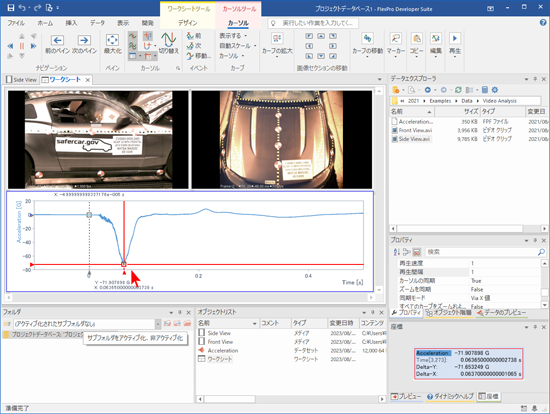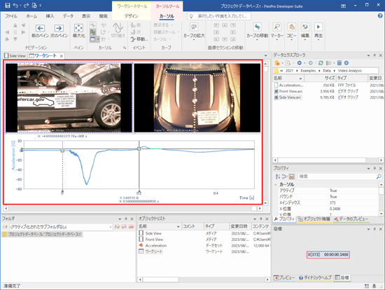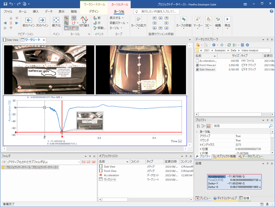 FlexPro に2つの動画が「メディア」として、計測データが「データセット」としてインポートされます。