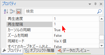 ※ 注意:動画の再生すると、それに伴ってダイアグラムのカーソルが移動します。ダイアグラムをクリックしたあと「プロパティ」ウィンドウの「再生間隔」をクリックすると、カーソルが追跡する増分を秒単位で設定できます。
